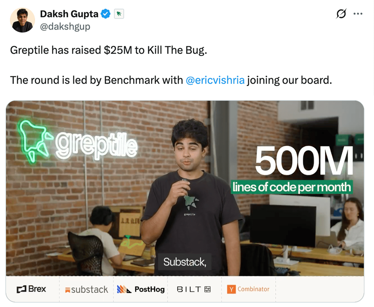 That somewhere else might be security verification. Greptile just raised $25 million from Benchmark (the same firm that made early bets on Uber and Twitter) specifically to build AI-powered code review for security vulnerabilities.