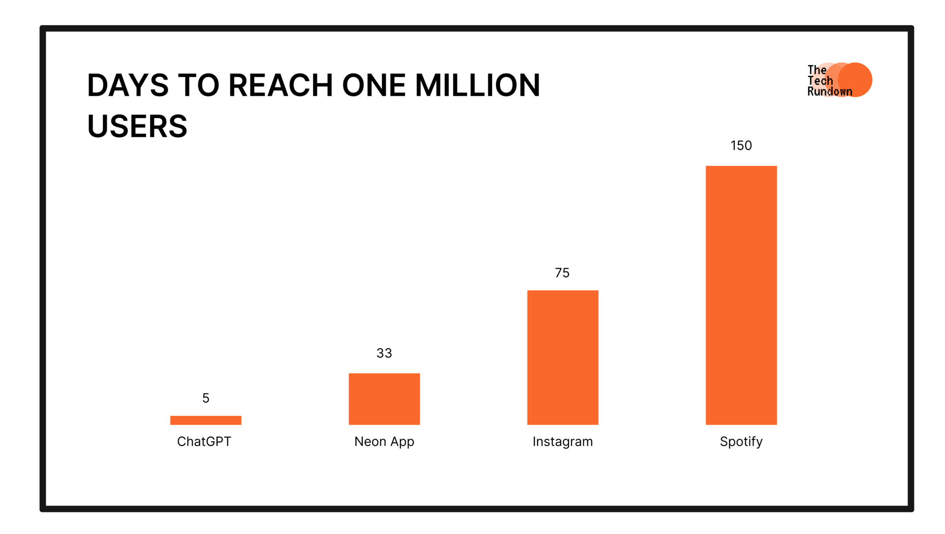 Even if downloads cut in half to 32,000/day, Neon would hit one million users in 33 days, faster than Instagram (2.5 months), Spotify (5 months) or Facebook (11 months), though still nowhere near ChatGPT's record five days. Not bad for an app whose entire value proposition is "we'll pay you to wiretap yourself."